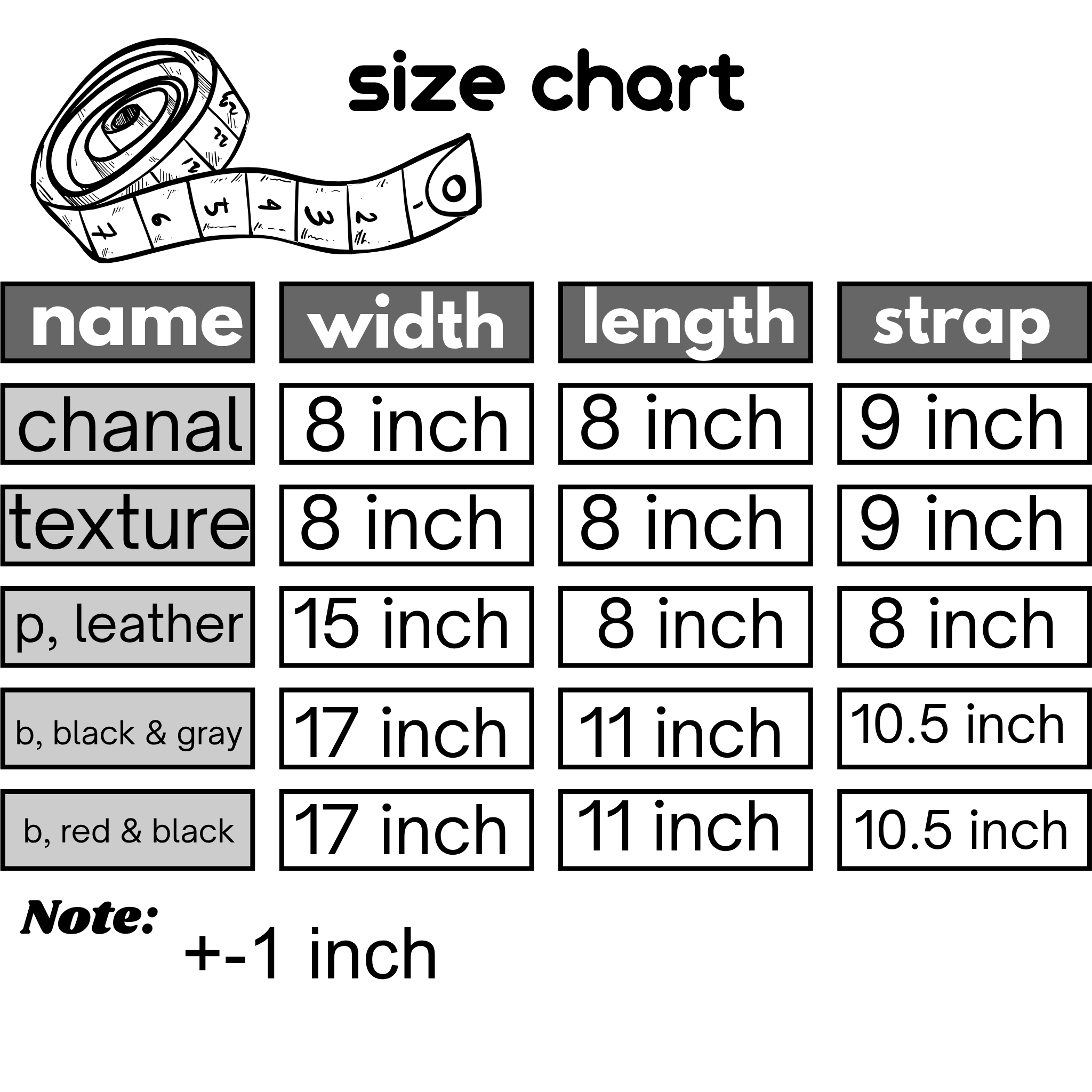 • B, Red & Black: Width: 17", Length: 11", Strap: 10.5" (Note: Pemaish mein +-1 inch ka mamooli farq ho sakta hai)